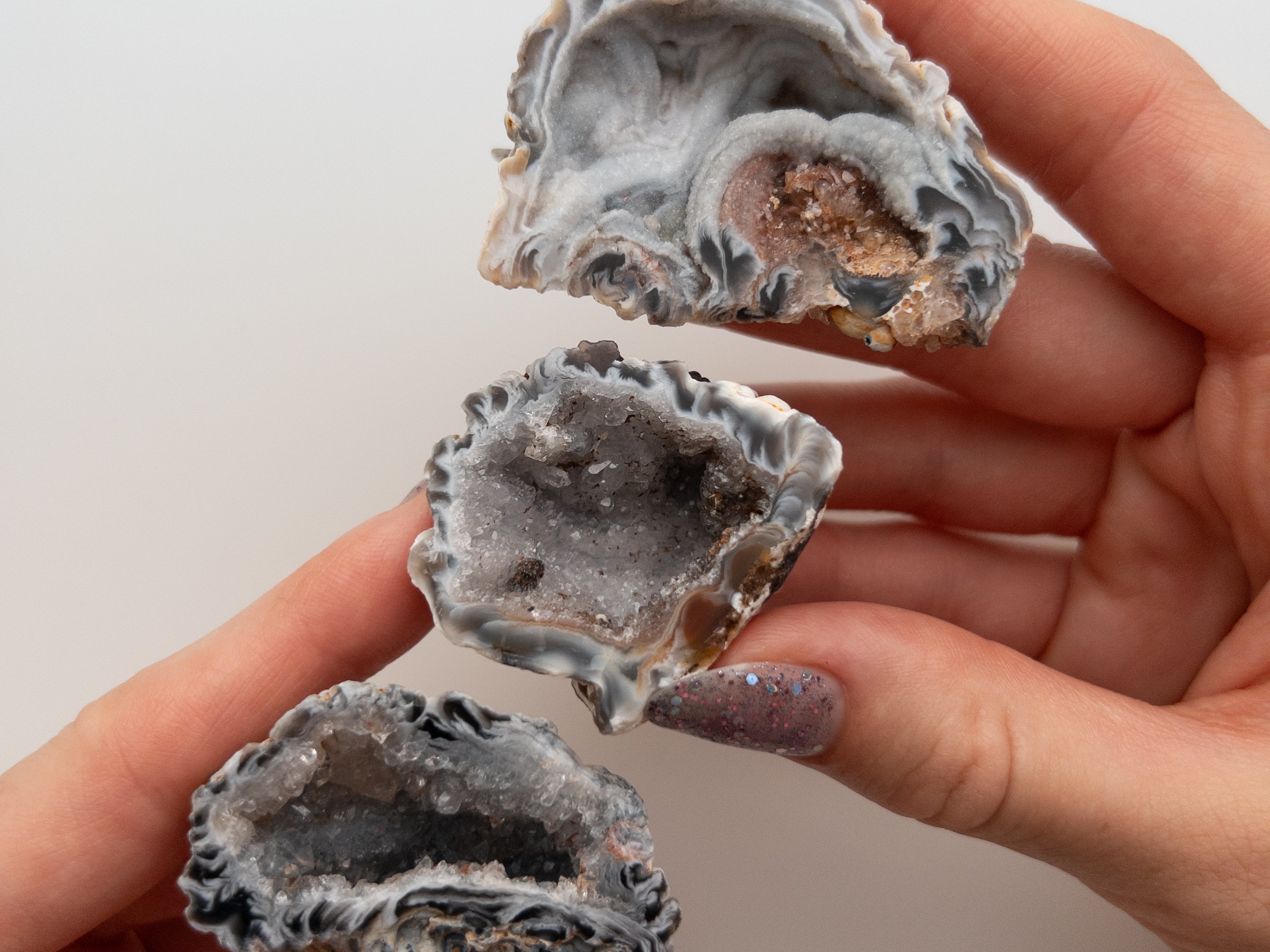 Fun Fact: Agate geodes form in volcanic rocks when gas bubbles become filled with mineral-rich solutions, creating vibrant, multi-colored crystals over time. The druzy sparkle inside is created as tiny crystals form in the hollow center, giving each geode a magical, glittering effect.