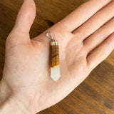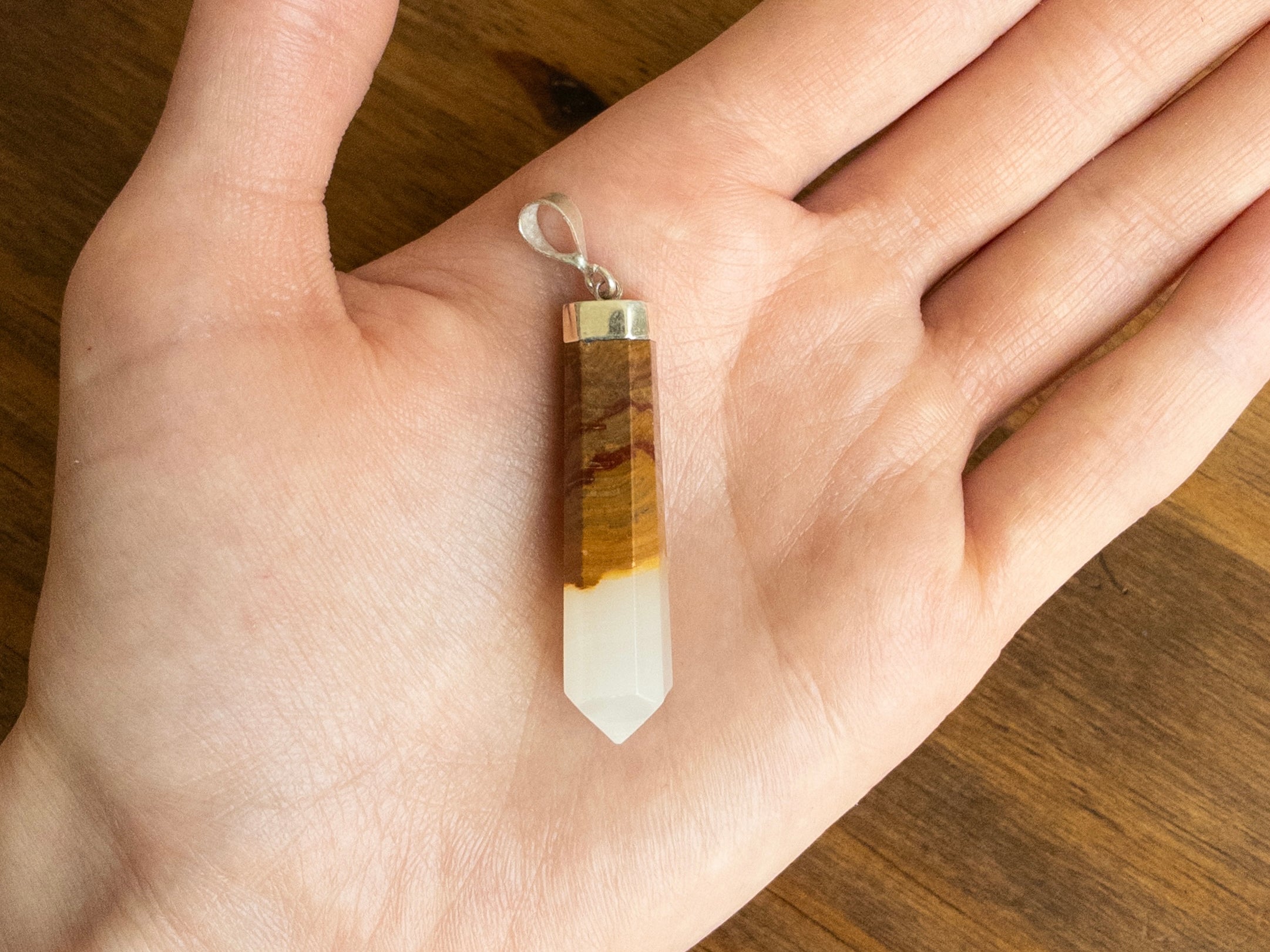 These sterling silver-capped pendants offer a perfect balance of simplicity and elegance, designed to complement any outfit. Featuring Banded Calcite, this stone showcases striking brown and white bands, polished to a smooth, glossy finish that highlights its unique patterns. Each pendant is one-of-a-kind, with no two pieces alike due to the natural variation in the banding. A timeless piece, perfect for adding a touch of natural beauty to your collection or as a thoughtful gift.