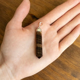 These sterling silver-capped pendants offer a perfect balance of simplicity and elegance, designed to complement any outfit. This version features Chocolate Calcite, a richly patterned stone with dark brown tones and creamy beige banding. Polished to a smooth finish, each pendant highlights the natural layering and earthy colors that make this variety of calcite so visually striking. Every piece is unique—making them an easy favorite for everyday wear or gifting.